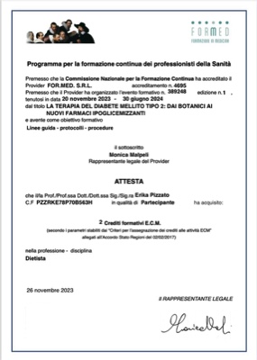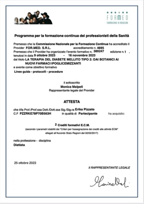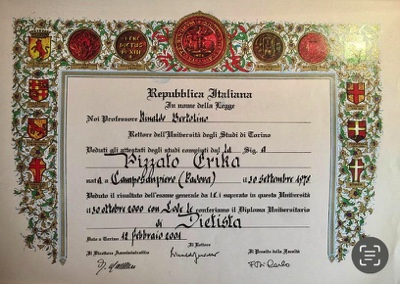 DIPLOMA UNIVERSITARIO DI DIETISTA PRESSO LA FACOLTA’ DI MEDICINA E CHIRURGIA DI TORINO conseguito il 30 ottobre del 2000 con lode